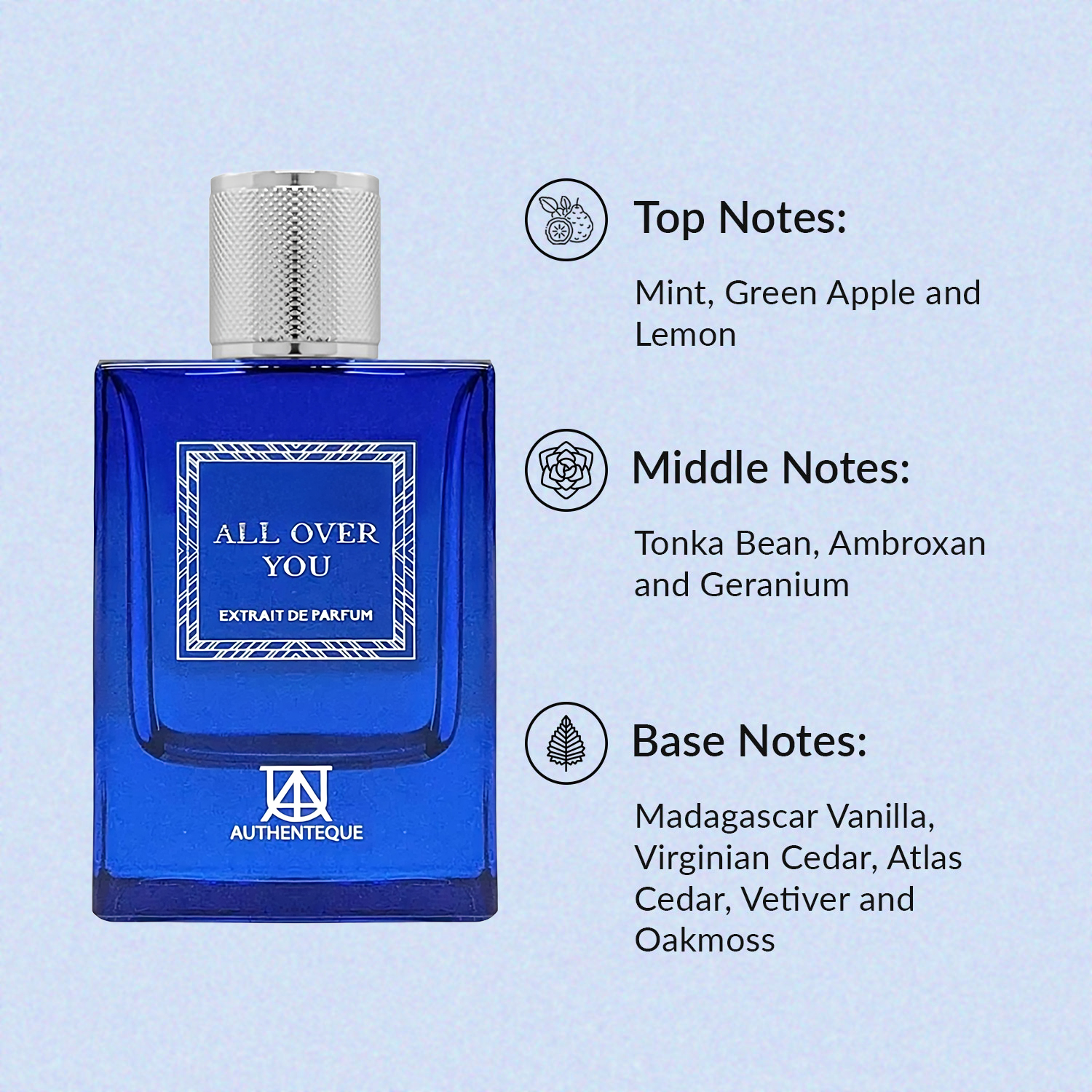 Top Notes : refreshing blend of mint , green apple and lemon for a crisp energizing start . Middle Notes: Tonka bean, ambroxan and Rich Base notes : Madagascar vanilla and a duo of cedars from Virginia and Atlas, anchored by earthy vetiver and enigmatic oakmoss.